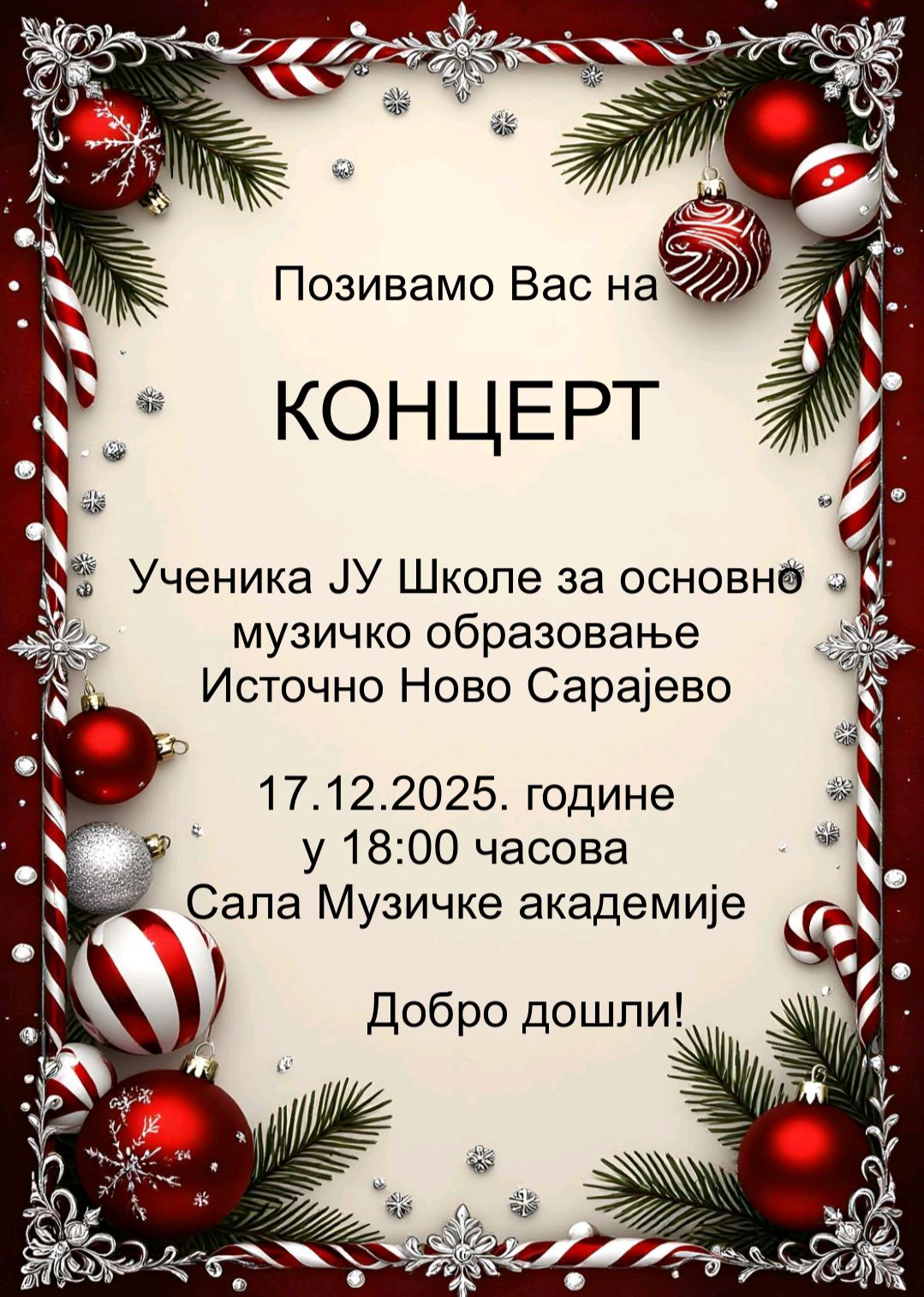 Овај догађај био је централна тачка децембарских свечаности наше школе, гдје су наши вриједни ученици, кроз пажљиво одабран музички програм, представили свој напредак и таленат стечен током протекле године. Сцена је била испуњена празничним духом и надахнутим извођењима која су награђена громогласним аплаузима присутне публике.